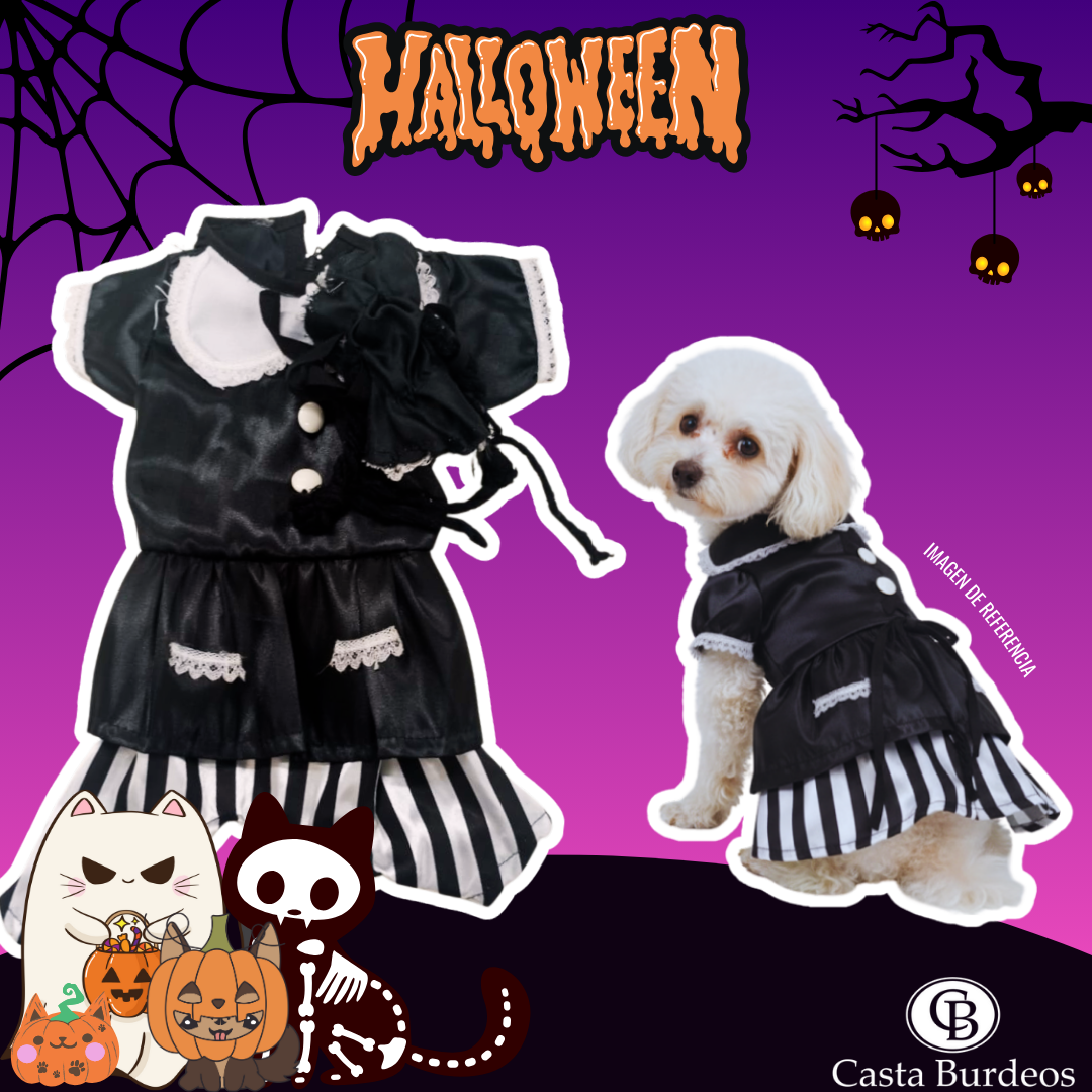 Es la elección perfecta para quienes buscan un look único y con mucho estilo en Halloween. Este atuendo reproduce el icónico vestido negro con cuello blanco que caracteriza al personaje, logrando que tu perro o gato se convierta en el alma (oscura) de la fiesta.