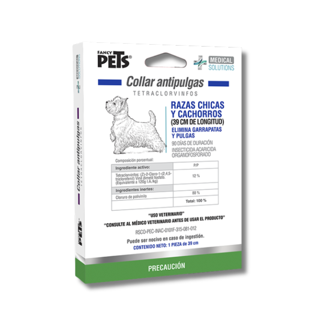 Collar antipulgas para perros de razas pequeñas y cachorros a partir de 6 semanas de edad. Formulado por Medical Solutions®, actúa como acaricida eficaz contra pulgas y garrapatas, paralizando los parásitos y provocando su eliminación, además de prevenir la reinfestación.