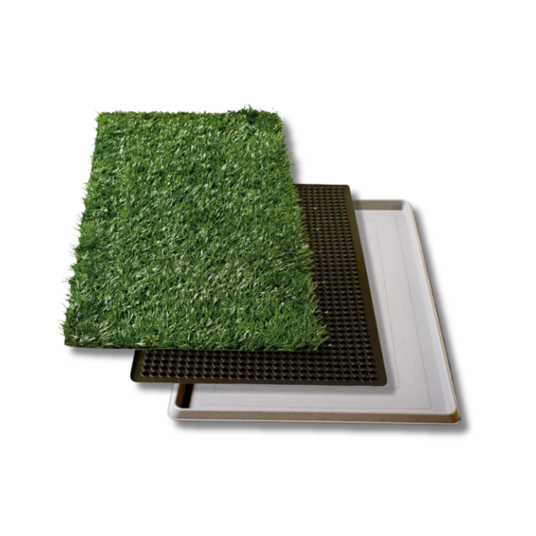 Kit completo para el entrenamiento higiénico de cachorros pequeños. Este tapete incluye pasto sintético, rejilla antihumedad y charola, proporcionando un área limpia y cómoda para que tu peludo haga sus necesidades. ✨