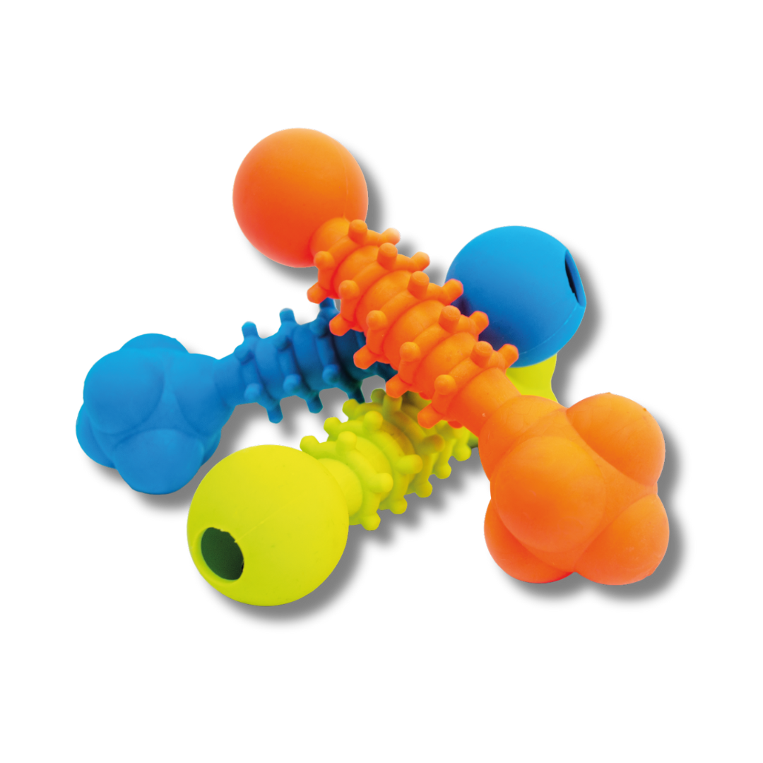 Juguete interactivo de caucho sólido dentado con cascabel integrado, ideal para perros pequeños y medianos. Perfecto para morder, lanzar y jugar, ayudando a mantener la actividad física y estimulando el juego independiente o compartido.